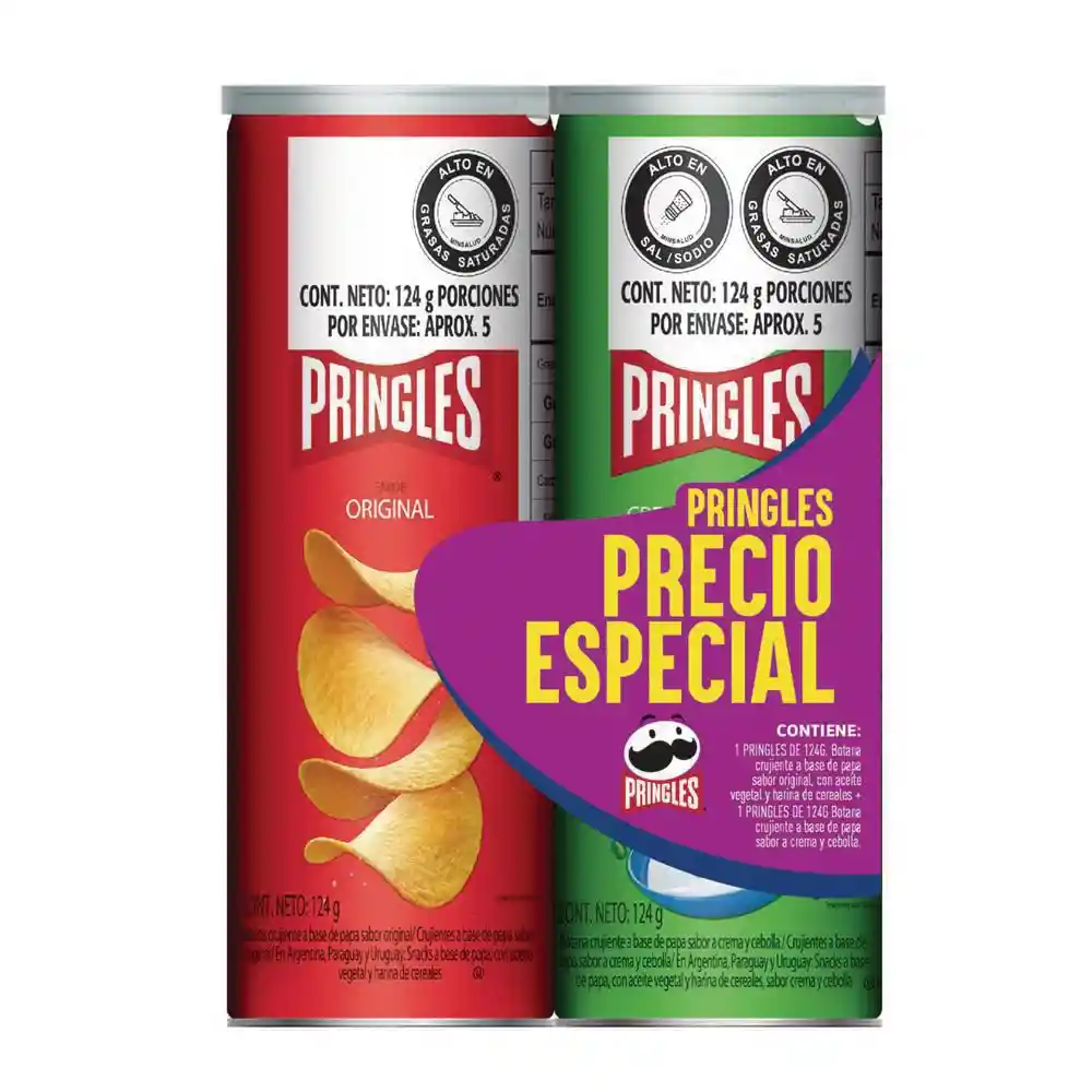 Pringles Contiene 2 Unidades. Botana Crujiente a Base de Papa Sabor Original Con Aceite Vegetal y Harina de Cereales 124 g 1 Und + Botana Crujiente a Base de Papa Sabor Crema y Cebolla 124 g Und.
