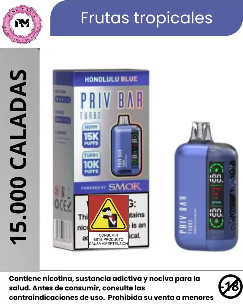 Vape Vapeador Vapes El desechable Priv Bar Turbo 15.000 puffs combina un diseño moderno con funciones avanzadas para una experiencia de uso cómoda y duradera. Su batería recargable de 800 mAh permite sesiones prolongadas, mientras la pantalla LED muestra el estado de carga y nivel de líquido en tiempo real. Con 16 ml de líquido y una concentración de sales de nicotina del 5%, ofrece un rendimiento potente en dos modos: estándar para hasta 15.000 caladas o modo Turbo para 10.000, con opción de ajustar el flujo de aire. Compacto, funcional y de alto rendimiento, es ideal para quienes buscan comodidad y control.