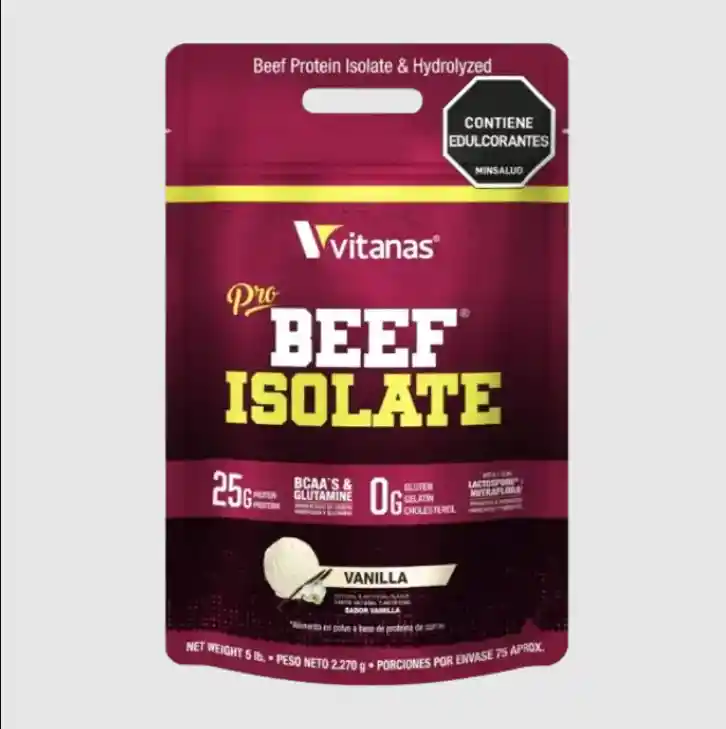 PRO BEEF ISOLATE® Es una proteína de carne aislada e hidrolizada libre de lactosa. Cada servicio contiene: 25 g de proteína de carne aislada e hidrolizada. 1 g de carbohidratos. 0 g de grasa totales. 0 lactosa. 0 gluten, gelatin, colesterol. 0 azúcar. Contiene Nutraflora® (prebióticos) y Lactospore® (probióticos). Modo de uso: Adultos, tomar 1 servicio (1 Cucharas medidora) al día. Mezclar 1 servicio de PRO BEEF ISOLATE® en 6-8 oz. de agua en un vaso o shaker. Agitar hasta obtener una mezcla homogénea. Tamaño de la porción: 30 gr (30 Servicios aprox) Contenido: 2 Libras/ Neto 908g Ingredientes: Proteína de Carne Aislada e Hidrolizada, Creatina Monohidrato, Prebióticos (Prebióticos (Nutraflora®). Probióticos LactoSpore® (Bacillus coagulans) Sucralosa, Estabilizante (Goma Guar), Lecitina de Soya (emulsionante). Aminoácidos de Cadena Ramificada (Leucina, Isoleucina y Valina), Glutamina, Sabores naturales y artificiales. Sabor: Vainilla Método de conservación: El producto debe estar almacenado en su empaque original a temperatura inferior a 30°C y a una humedad relativa inferior a 75%. No introducir elementos húmedos, después de abierto consumase en el menor tiempo posible. ADVERTENCIA: Este producto no pretende diagnosticar , tratar, curar, o prevenir enfermedades. Este producto es un alimento y no debe ser usado como sustituto de una dieta equilibrada.