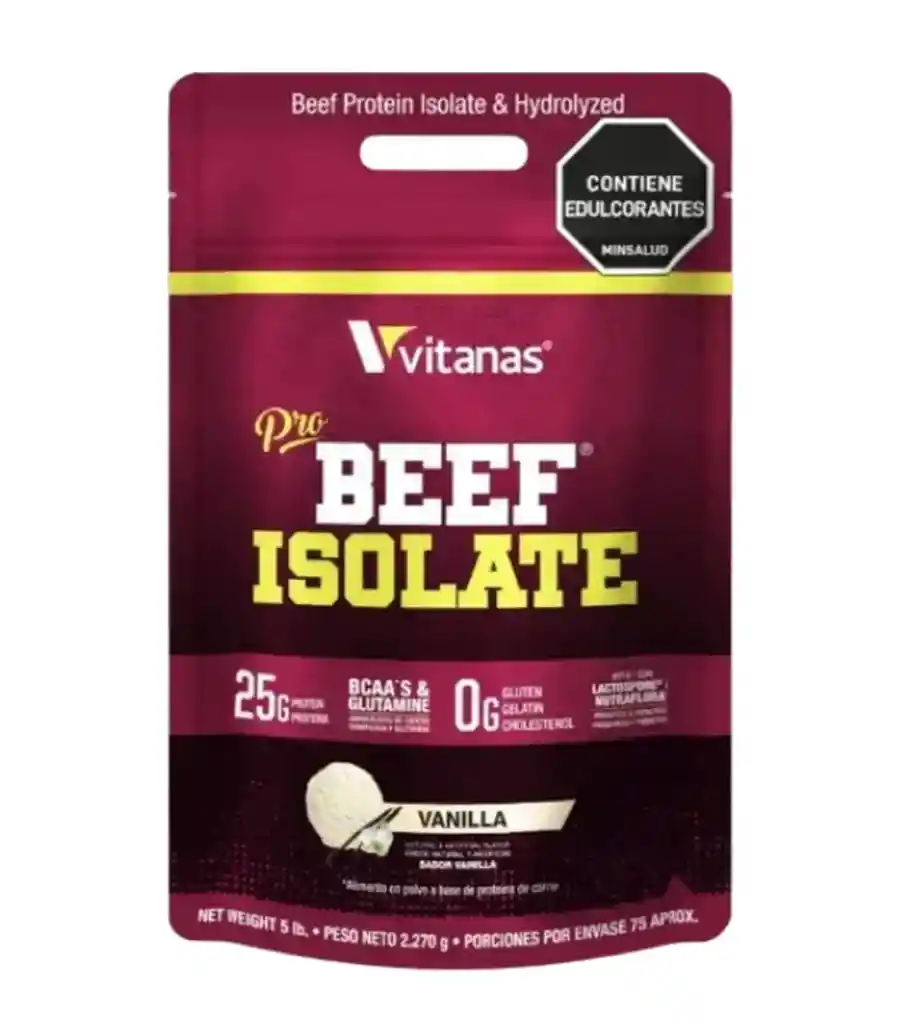 Pro Beef Isolate 5 Lb de Vitanas es una proteína derivada de carne hidrolizada, excelente alternativa libre de lactosa para aumentar masa muscular magra y recuperación. Producto registrado por Invima.Presentación: Tarro por 5 lb (2.27 kg).Dosis recomendada: 35 g (1 scoop). Servicios por tarro: 65 servicios.