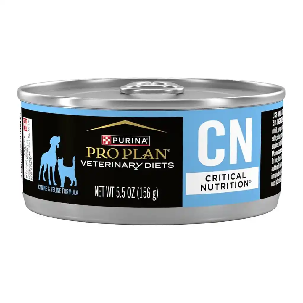 Pro Plan CN (Critical Nutrition) en lata es un alimento húmedo terapéutico de alta energía y digestibilidad, diseñado por Purina para perros y gatos que necesitan soporte nutricional intensivo. Sirve para recuperar el apetito, combatir la inapetencia, y facilitar la alimentación durante convalecencias, postoperatorios o enfermedades gracias a su textura blanda y alta palatabilidad. Principales usos y beneficios de Pro Plan CN: Soporte Nutricional Intensivo: Ideal para mascotas que se encuentran en estado crítico, convalecientes o que han sufrido pérdida de peso. Alta Palatabilidad: Su sabor a pollo está diseñado para incentivar la ingesta en animales inapetentes. Fácil Consumo: La textura húmeda y suave facilita la alimentación en animales con dolor bucal o debilidad extrema. Recuperación: Diseñado para la nutrición clínica tras cirugías, enfermedades graves o traumas.