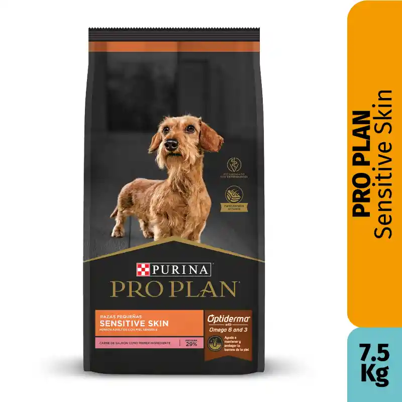 PURINA PRO PLAN SENSITIVE SKIN ADULTO RAZA PEQUEÑA, ayuda a minimizar el riesgo de la irritación de la piel asociada con la sensibilidad alimentaria 🐕 Formulado con fuentes de proteínas limitadas y seleccionadas como el salmón. También tiene un nivel optimizado de ácidos grasos Omega 3 y 6, vitaminas, antioxidantes, cobre y zinc, para reforzar la protección de la piel y promover una piel flexible y un pelaje brillante