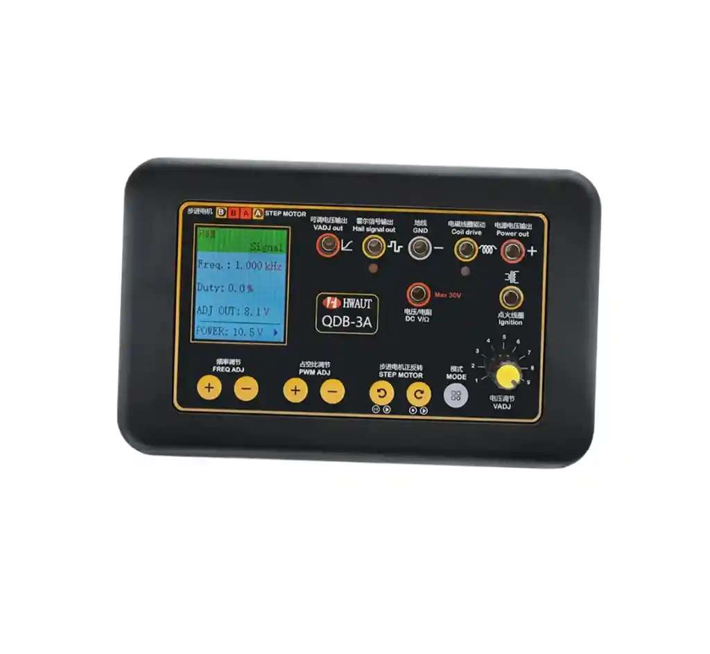 Funciones principales: (1) Prueba de accionamiento directo 12V-24V motor de gasolina y bobina de encendido del motor de gas natural; (2) Prueba de conducción directa 12V-24V inyectores de gasolina y diésel para vehículos (no se admiten piezoeléctricos inyectores). (3)Conduzca y pruebe directamente varios motores controlados por el ciclo de trabajo, como los motores de acelerador electrónico; (4) Accione y pruebe directamente varias válvulas solenoides de control del ciclo de trabajo, tales como: válvula dosificadora de combustible, Válvula Solenoide del bote, válvula solenoide EGR de recirculación de gases de escape, etc. (5) Conduzca y pruebe varios motores paso a paso de baja potencia, tales como: motores paso a paso de ralentí, motores paso a paso de instrumentos, motores paso a paso de rango de faros, etc. (6) Puede simular la señal del sensor del tipo de ciclo de trabajo, por ejemplo: señal del sensor de presión del aire acondicionado. Parámetros: (1) Señal Hall (onda cuadrada) con frecuencia de salida ajustable, amplitud y ciclo de trabajo. (2) Rango de frecuencia: 1HZ-100KHZ (3) Rango de amplitud de señal: 1,3 V-12V (4) Rango de ciclo de trabajo: 1%-100% (5) Pulso de accionamiento del motor paso a paso, control de avance y retroceso. (6) de alimentación externa Fuente: 12V-24V, se recomienda utilizar una fuente de alimentación estabilizada de la batería del coche (requiere una corriente de salida superior a 5A). (7) Toma de salida de voltaje de fuente de alimentación: El voltaje es igual al voltaje de fuente de alimentación externa, la corriente de salida es 3A, con protección contra sobrecorriente (apagado automático cuando la corriente es demasiado grande). (8) Toma de salida de voltaje ajustable: voltaje 1,3 V-12V continuamente ajustable, corriente 1A. (9) Conector de salida de señal Hall: salida de señal Hall (onda cuadrada) de ciclo de trabajo negativo (10) Zócalo de accionamiento de bobina electromagnética: control de ciclo de trabajo, corriente de accionamiento 3A.