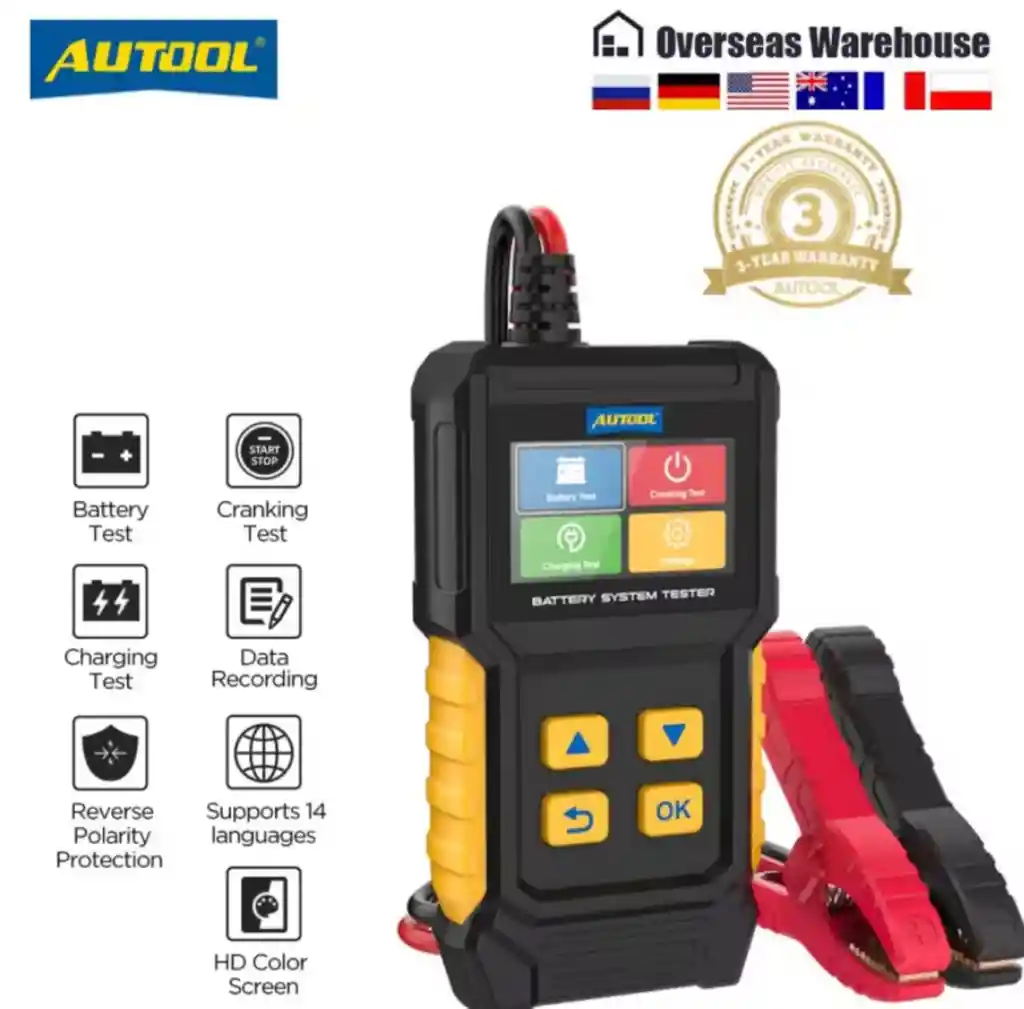 AUTOOL-probador de carga de batería de coche BT360, desarrollado con dedicación para probar baterías de plomo-ácido de 12V inundadas, baterías automotrices, PLACA PLANA AGM, espiral AGM, GEL y baterías EFB. Proporciona a los técnicos o DTYer una solución rápida, simple y rentable para conocer mejor el estado de carga de la batería, comprobar el estado de la batería y detectar fallas. Tres funciones de prueba de pasos de operación del probador de carga de batería de coche AUTOOL BT360 Paso 1. Conecte la batería de 12V, los clips rojos al polo positivo y los clips negros al polo negativo. Paso 2. Prueba de batería: Primero seleccione el tipo de batería que se probará, luego los criterios de prueba y el rango de prueba, y luego tendrá los resultados en unos segundos. Paso 3. Prueba de arranque: Después de seleccionar la función de prueba de arranque, siga las indicaciones para arrancar el motor. Prueba completada. Paso 4. Prueba de carga: después de entrar en la función de prueba de carga, siga el aviso para aumentar la velocidad a 2500 RPM durante 5 segundos, luego presione OK. Prueba completada. AUTOOL BT360 12V características del probador de carga de la batería del coche: [Multifunción]: El probador de batería AUTOOL BT-360 incluye prueba de batería, prueba de arranque, funciones de prueba de carga. Se centra principalmente en analizar el estado de salud de la batería. Detecta directamente si la batería es buena o mala y presenta soluciones sugeridas. [Profesional y confiable]: los estándares de prueba incluyen la mayoría de los estándares de batería EN el mundo, CCA, BCI, CA, MCA, JIS, DIN, IEC, EN, SAE, GB, que cubre desde 100- 2400 CCA, 30-220 AH. [Eficiencia y seguridad]: El dispositivo viene en un embalaje resistente, con una película antiarañazos en la pantalla. Usando tecnología conductora avanzada, puede mostrar directamente los resultados de alta precisión de la información del vehículo. Diseñado con protección de conexión inversa de polaridad. No dañará el dispositivo ni afectará al coche o la batería. [Soporte multilingüe]:10 idiomas son Disponible. Disponible en inglés, español, alemán, francés, italiano, ruso, polaco, chino, holandés y japonés. Se pueden personalizar otros idiomas. Lista de embalaje: 1 probador autool bt360 probador de carga de la batería del coche 1 Manual