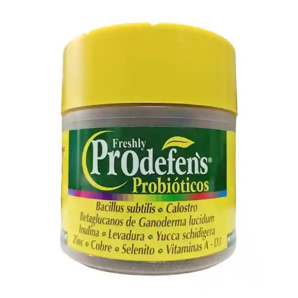 PRODEFEN´S PROBIOTICOS NATURAL FRESHLY 100 VITACRUNCHS --------------------------------------------- + Agiliza la respuesta contra agentes patógenos. + Mejora la digestión y promueve el equilibrio intestinal de tu mascota. + Aumenta la absorción de nutrientes. *** ¿CÓMO LO DÁRSELO? ¡ES MUY SENCILLO! 1. Durante el paseo o como Snack después de comer. 2. Recuerda revisar la tabla de peso para saber cuántas puedes darle a tu perro al día. *** ¡ATENCIÓN A ESTO! - Este producto es ideal para: * Perros de todas las edades (cachorros, adultos y senior). * Perros con problemas digestivos, defensas bajas o sensibilidad alimentaria. * Perros activos o en recuperación. - Restricciones: * Uso exclusivo en perros. * No exceder la dosis recomendada. * Consultar con veterinario si el perro está en tratamiento médico. *** ¿QUIERES SABER MÁS? Este producto contiene: Bacillus subtilis, Calostro, Betaglucanos, Inulina, Levadura, Yucca schidigera, Zinc, Cobre, Selenito, Vitaminas A y D3. Gracias a su fórmula avanzada con probióticos y prebióticos, ayuda a mantener el intestino saludable, facilita la absorción de nutrientes y fortalece el sistema inmunológico. Además, su presentación en Vitacrunch es deliciosa y fácil de administrar como premio diario. *** POR TU COMPRA RECIBIRÁS 1 x Frasco Prodefen´s Natural Freshly Con 100 Vita Crunchs (Tabletas Masticables Sabor Manzana)