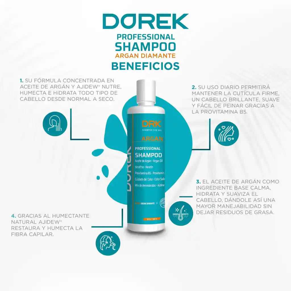 Professional Shampoo Argan Diamante SIN PARABENOS - SIN SAL Professional Shampoo de Aceite de Argán, Ajidew®, Keratina y Provitamina B5, diseñado para brindar hidratación y brillo intenso, nutrir y humectar todo tipo de cabello. Restaura la fibra capilar y el brillo del cabello, increíbles resultados en cabellos naturales de normal a seco, debilitados, opacos, maltratados y expuestos a procesos químicos. Beneficios: Su fórmula concentrada en Aceite de Argán y Ajidew® nutre, humecta e hidrata todo tipo de cabello desde normal a seco. Su uso diario permitirá mantener la cutícula firme, un cabello brillante, suave y fácil de peinar gracias a la Provitamina B5. El aceite de argán como ingrediente base calma, hidrata y suaviza el cabello, dándole así una mayor manejabilidad sin dejar residuos de grasa. Gracias al humectante natural Ajidew® restaura y humecta la fibra capilar. Ayuda a la protección del color y tratamientos químicos gracias a su fórmula libre de sal y parabenos. MODO DE USO Humedezca el cabello y aplique Professional Shampoo Argán Diamante de manera uniforme sobre el cabello y trabaje la textura en las manos. Aplicar primero en el largo del cabello y las puntas. Emulsionar, comenzar en las puntas y luego cubrir el largo del cabello, hasta que se forme la espuma. Luego esparcir el producto hacia las raíces, trabajar el cabello desde abajo hacia arriba. Masajear y enjuagar, sin fricciones. Repita si es necesario, enjuague con abundante agua.