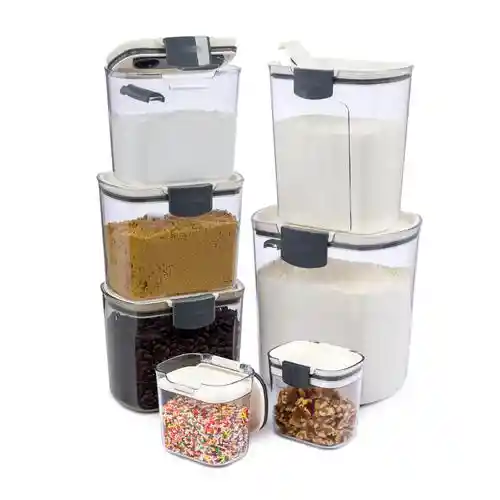 Set Contiene 7 Unidades. Este Juego de Almacenamiento Para Cocina de 7 Piezas Incluye Recipientes Para Harina Azúcar Granulado Moreno o en Polvo Café y Dos Mini Recipientes Para Frutos Secos o Especias. Cada Uno Cuenta Con su Propia Cuchara Medidora y Tapa Hermética a Presión Con Orificio en Silicona Para Facilitar a la Hora de Medir o Racionar Las Cantidades y Mantener Tus Alimentos Frescos Durante Más Tiempo.