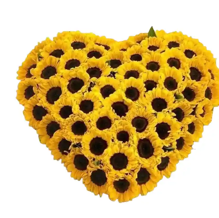 Bouquet en forma de corazon en girasoles. La flor puede ser sustituida dependiendo la disponibilidad de color y del producto “Mensaje Personalizado” máximo de 30 caracteres (Dejar el mensaje en el chat, los comentarios no se previsualizan para la tienda por lo que si se dejan allí no podrá ser incluido).
