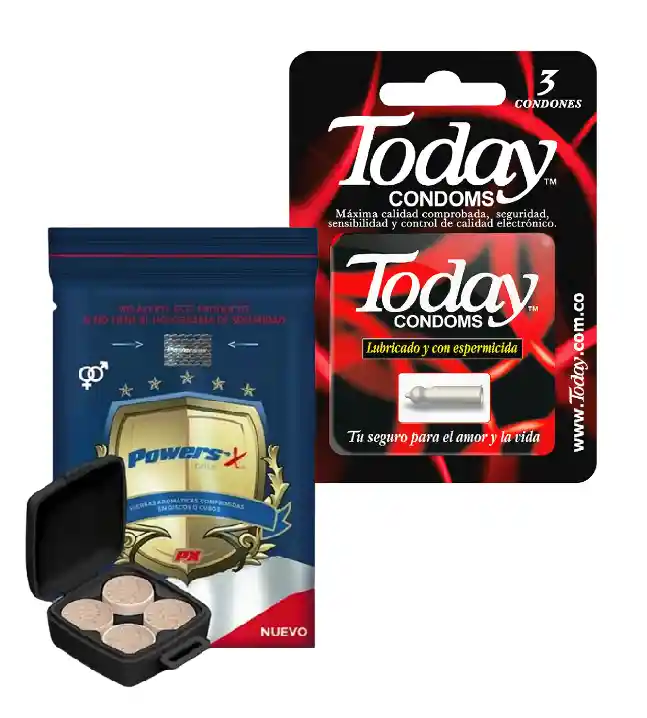 Todo lo que necesitas para ese encuentro. Un combo perfecto para que disfrutes al maximo: Condones Today: Today Condoms Lubricado y con espermicida Provee protección adicional por su Espermicida. Especialmente lubricado para crear una sensación natural. Powersex: Este energizante basado en frutas y plantas intensifica las virtudes de los nutrientes afrodisíacos más reconocidos a nivel mundial, favoreciendo la producción de factores hormonales que actúan en el organismo de manera natural para aumentar el deseo y la sensación de placer sexual. Tomar 1 comprimido 30 minutos antes de el acto sexual.