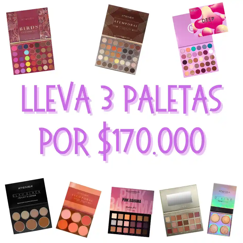 LLEVA TRES PALETAS DE SOMBRAS Y/O ROSTRO POR $170.000 LAS CONDICIONES SON: 1. Debes elegir dos paletas de entre las que ves en la foto y, nosotras elegiremos la tercera de entre esas mismas 2. Debes enviar tu elección a la línea de WhasApp 314 225 1851, de no hacerlo te enviaremos tres paletas aleatoriamente (de entre las que están en la foto)