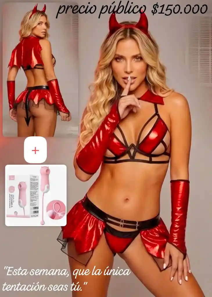 «Llegó la hora de portarse mal para pasarla muy bien. Nuestro conjunto ‘Diablita Traviesa’ es perfecto para esas escapadas de Semana Santa donde el calor no solo está en el clima.» Incluye: 1 disfraz ( cachos, top varilla, falda con cola, tanga, guantes) 1 succionador qiqi mini