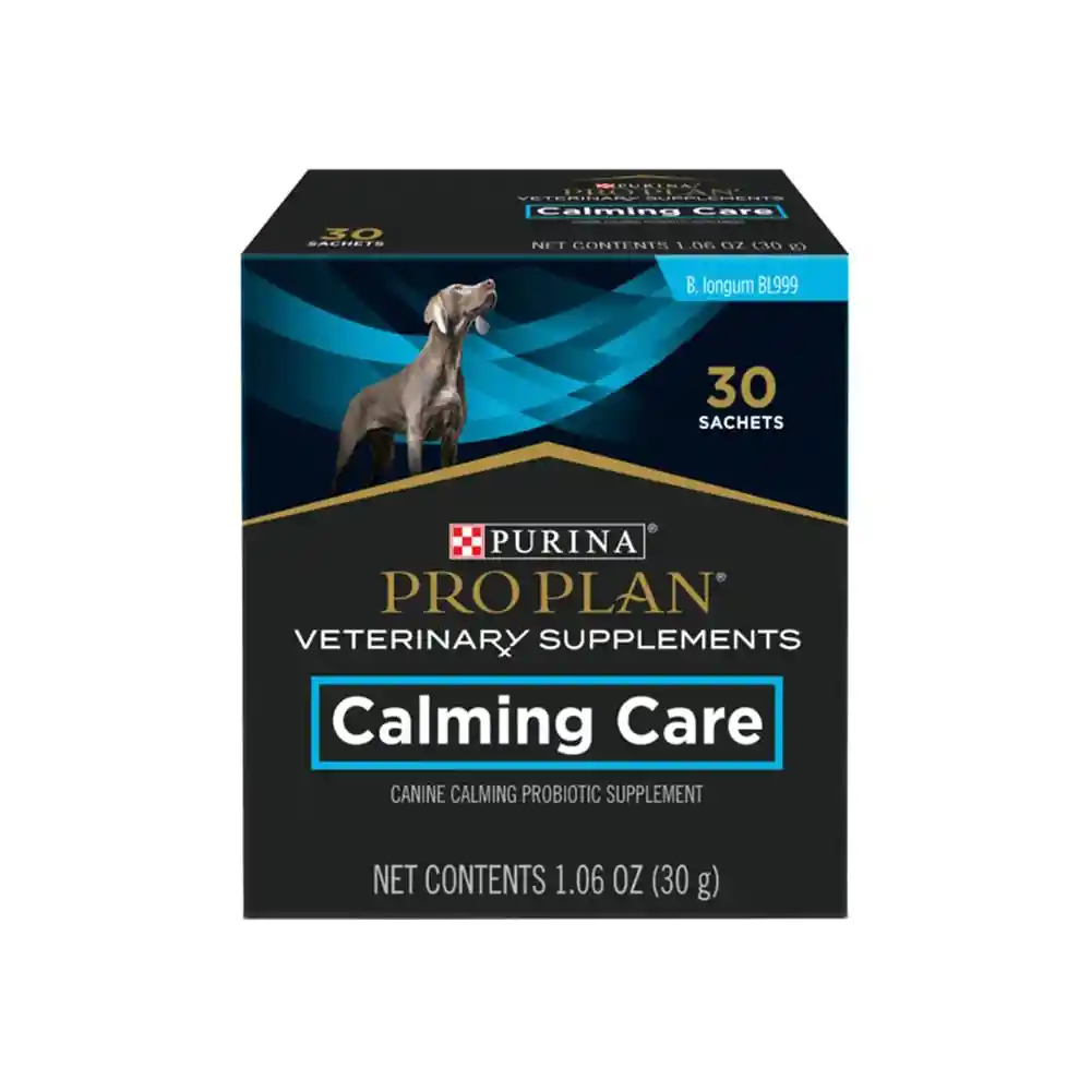 Pro Plan Veterinary Diets – Calming Care Canine (30 sobres) Es un suplemento probiótico nutricional para perros de todas las edades, compuesto con la cepa bacteriana Bifidobacterium longum BL999 (≥ 1×10⁹ UFC/g), con efectos demostrados en la reducción de síntomas de ansiedad, nerviosismo o reactividad leve causada por cambios de rutina, visitas, separación o ruidos fuertes.
