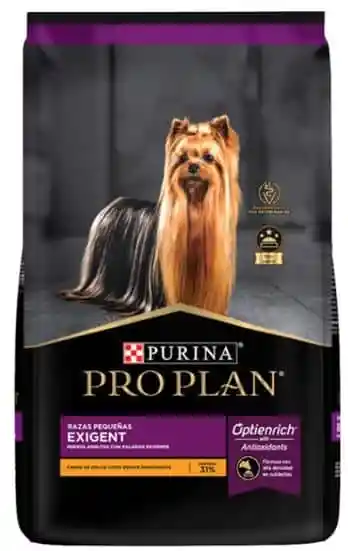 Proplan Exigent Razas Pequeñas. Provee nutrición que podrás percibir por medio de un pelaje sano y brillante con un sabor único que los perros de razas pequeñas con los paladares más exigentes disfrutaran. Nutrición de vanguardia que satisface las necesidades específicas de perros adultos de razas pequeñas con paladares exigentes, para que alcancen un estado de salud óptima y un bienestar general. Formulado con VitaComplex-7, una combinación exclusiva de vitaminas, minerales y aminoácidos Con una mezcla concentrada de nutrientes, que incluye proteína de alta calidad de carne fresca de pollo, con un sabor excepcionalmente atractivo, incluso para los perros más selectivos. Incluye selenio, beta-glucanos, antioxidantes vitales y vitaminas para estimular el sistema inmunológico, proporcionando así un buen estado de salud general.
