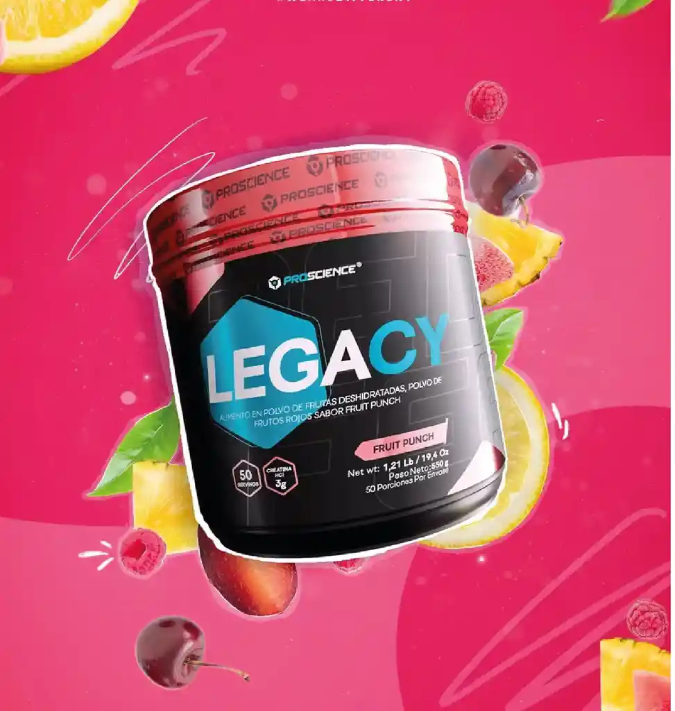Legacy Proscience Nota: El Sabor Del Producto Está Sujeto a la Disponibilidad si Necesitas un Sabor en Específico Favor Comunicarse Con el Rappi Tendero Antes de Que Recojan el Producto. Sabores: Fruit Punch Sandía y Uva es Nuestra Creatina Hcl de Mejor y Más Rápida Absorción Por lo Que Siempre Vas a Requerir Menos Cantidad Para Obtener Los Mismos Resultados Es un Producto Que Resulta de la Unión de 3 Aminoácidos: Arginina Metionina y Glicina En su Forma Ácida Hcl Tiene Una Gran Biodisponibilidad y Excelente Absorción Contiene Además Leucina el Aminoácido Estrella Que Garantiza la Síntesis Proteica y Estimula el Desarrollo de la Masa Muscular. En Esta Nueva Fórmula Legacy Añade Betaína Que Controla la Acidez y Mejora el Perfil Hormonal de Igf-1 Ayudando a Mejorar la Composición Corporal. Definitivamente Legacy es Ideal Para Entrenamientos Exigentes Con un Sabor Inigualable. Presentación: 330 g Registro Sanitario: Nsa-0006177-2018 Ingredientes:Polvo Deshidratado de Fruta L-Leucina Ácido Metil Guanido Acético (L-Arginina L-Metionina L-Glicina) Trimetilglicina (Betaína) Carboximetilcelulosa (Cmc) Fosfato Tricálcico Saborizante Idéntico al Natural Vitamina C (Ácido Ascórbico) Stevia Ácido Málico Dióxido de Silicio Colorante (Rojo) .