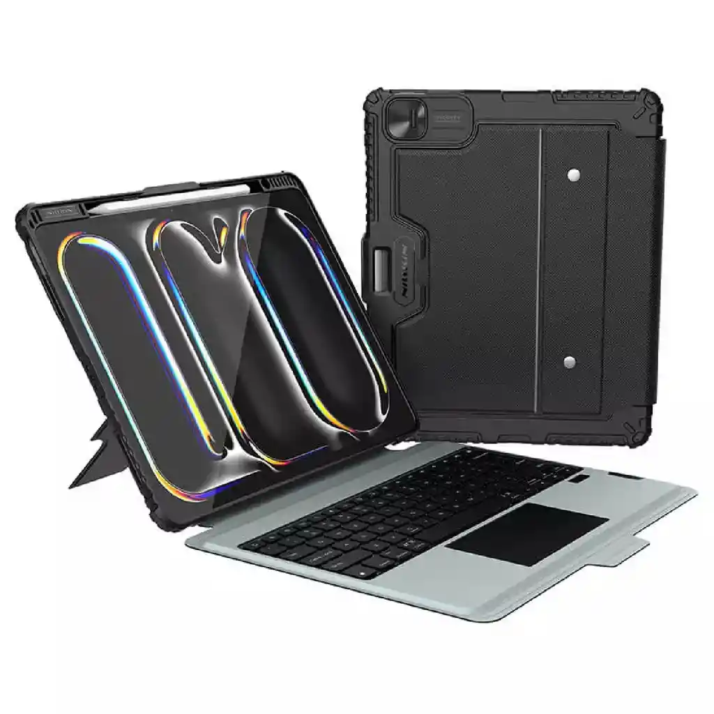 Protector con Teclado (versión retroiluminada) con multifunción, cuenta con un soporte ajustable, un teclado extraíble y un trackpad que lo hacen conveniente para escribir, ver, leer y bosquejo. También le permitirá disfrutar de una experiencia de operación flexible. El estuche anticaídas de grado militar adoptado se ajusta firmemente alrededor de los bordes del iPad, ofreciendo protección total. El diseño patentado de cubierta deslizante para cámara protege eficazmente la cámara del iPad contra la abrasión y los rasguños. La tela de PU concisa y delicada se combina con la estética del iPad, una integración perfecta de arte y tecnología.