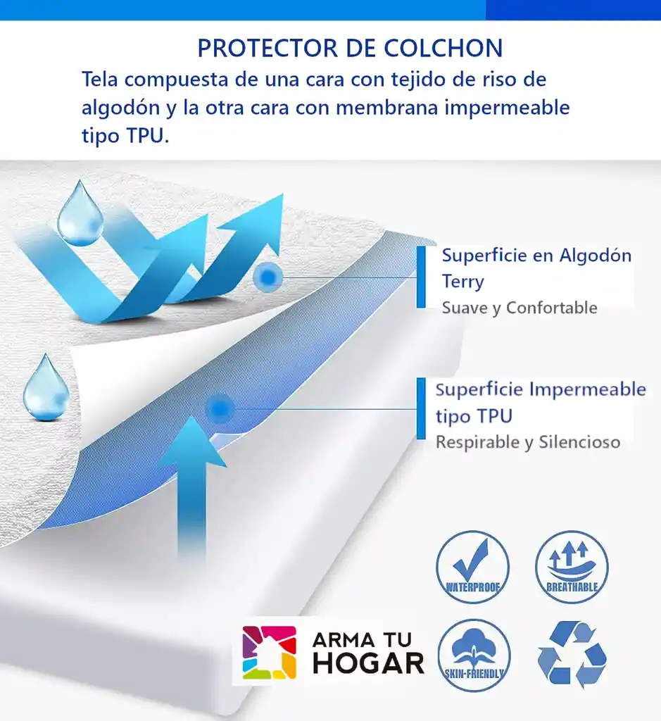 El colchón es una inversión la cual debemos extender su vida útil al máximo, y este protector lo protege de hongos, manchas, polvo y ácaros. Tela compuesta de una cara con tejido en riso de algodón y la otra cara con membrana impermeable tipo TPU, especialmente diseñada para permitir que el aire pase de manera efectiva y evitar fugas de líquidos. Impermeable y transpirable: Nuestro protector de colchón tiene un respaldo de TPU impermeable que protege la parte superior del colchón. La funda de colchón protege contra el sudor, la orina, los líquidos y las manchas, prolongando la vida útil de tu colchón. El respaldo impermeable silencioso permite que el calor corporal y el aire fluyan, manteniendo tu colchón fresco y seco. Hipo alergénico: Material que nos ayuda a disminuir el riesgo de provocar un síntoma alérgico o una reacción alérgica al producto adquirido. Silencioso y Cómodo: La superficie de tejido de rizo de algodón permite que el aire y el calor pasen, asegurando suavidad y gran transpirabilidad. La membrana de TPU impermeable especialmente diseñada está hecha de material elástico de calidad que es ultra suave y flexible, y no causará los sonidos de goma y balanceo que otros protectores de colchón pueden hacer. Banda elástica de 360°: La banda elástica de 360° totalmente circundante no solo proporciona protección completa para la parte superior y los lados del colchón, sino que también garantiza un ajuste perfecto mientras que es muy fácil de quitar y lavar. El regalo perfecto: Nuestras fundas de colchón proporcionan un ambiente más cómodo para ti y tu familia. Es una opción perfecta para aquellos que tienen niños pequeños, niños, mujeres embarazadas, mascotas o personas mayores que sufren de incontinencia. Medidas Empaque: Ancho: 26 cm Alto: 32 cm Profundidad: 7 cm Peso: 800 grms Medidas de Protector: 140 x 190 x 35 cm para cama doble. No envuelve todo el colchón, solo una cara.