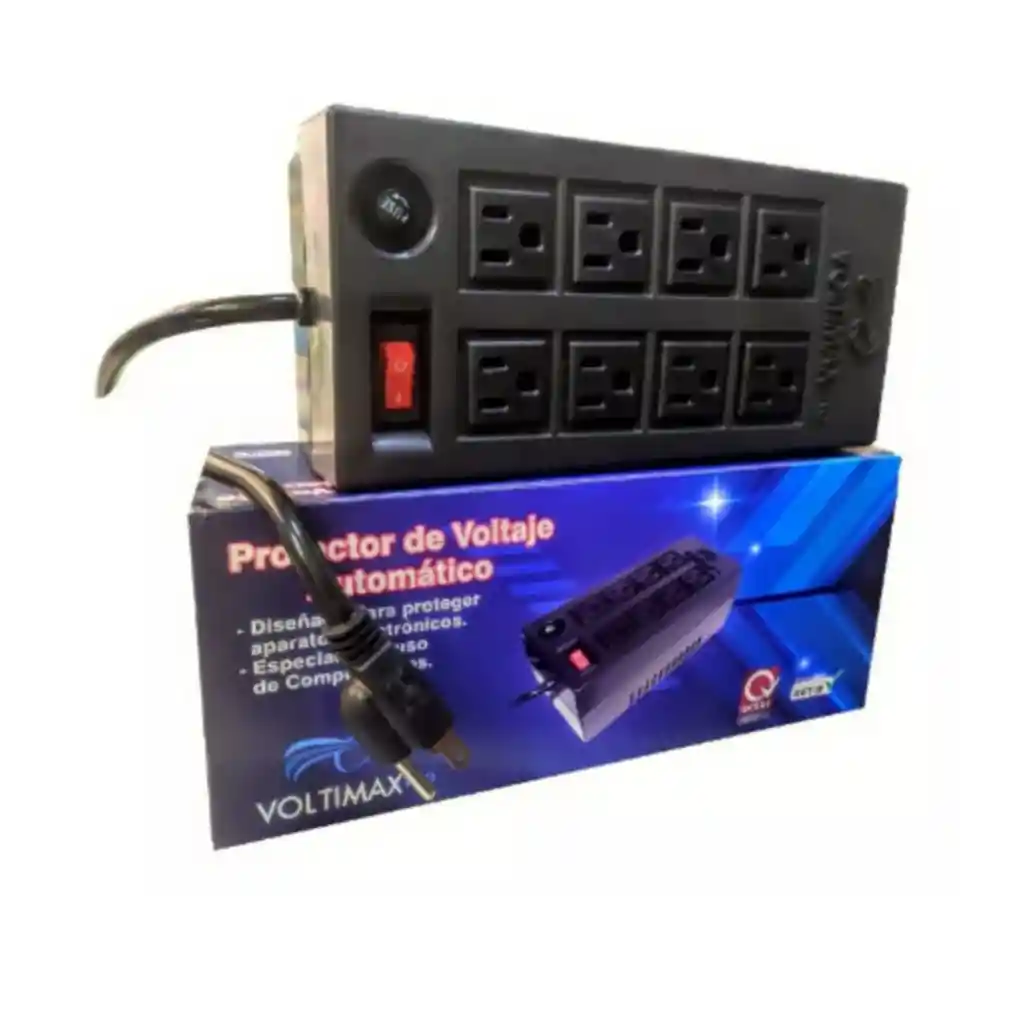 Apreciado cliente, tenga en cuenta, NO USAR para MICROONDAS, PLANCHAS, HORNOS, para evitar quemarlo, si esto sucede no aceptamos reclamos *** - Regulador automático de voltaje Voltimax Pro (NUEVO MODELO) - Carga : 1800 W ( Vatios ) máximo ( no sobrecargar mas de lo especificado ) - Diseñado para proteger los electrodomésticos de su hogar u oficina - 8 tomas de salidas de corriente reguladas - Marca: Voltimax modelo MPC-341 - Sistema electrónico mas liviano del mercado - Silencioso al ser electrónico - Cable de alimentación 95 cms - Salida de voltaje: 120V - 15A - Incluye fusible de protección: 250V - 10A - Incluye dos fusibles de repuesto gratis - Interruptor neón rojo - 15-20A a 125 V - Color del regulador: Negro - Indicador led de encendido - Supresor de picos de voltaje - Medidas: alto 9 , ancho 22 , profundo 11 cms - Precaución usar solo en zonas secas - Recomendamos usar con toma polo a tierra - Ideal para conectar: PC de escritorio, Portátiles, Neveras, TV, Consolas de juegos, Monitores equipos de sonido, DVD, despertadores, DVR, Fax, cámaras de vídeo y otros - Recomendamos conectar un PC completo ( CPU / Monitor / Impresora / Parlantes ) simultáneamente *** Apreciado cliente, tenga en cuenta que el regulador tiene un máximo de uso de 1800W, favor no puede excederlo, NO USAR PARA MICROONDAS, PLANCHAS, HORNOS, para evitar quemarlo. si esto sucede no aceptamos reclamos ***