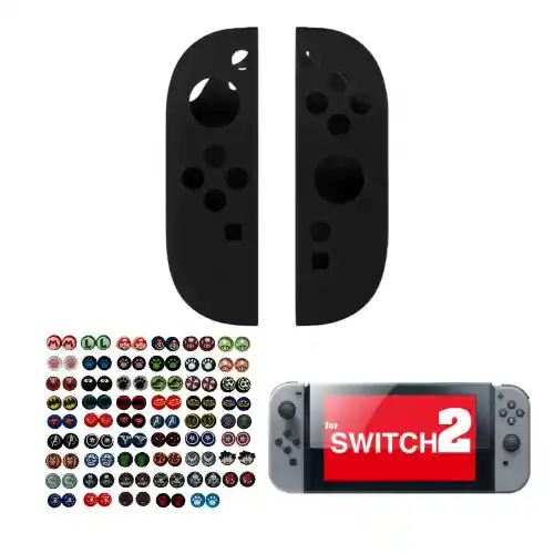 Protector En Silicona Negro + Vidrio + 2 Grips Para Joycon Switch 2