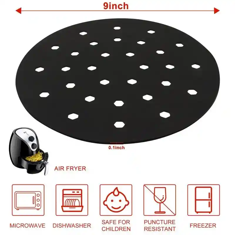 Presentado en material de primera calidad, rendimiento estable y largo tiempo de servicio. La superficie lisa hace que sea más fácil quitar los alimentos, manteniendo la comida deliciosa. El excelente rendimiento de nuestro producto te traerá una buena experiencia. Nuestro forro de silicona para freidora de aire puede satisfacer tus necesidades de revestimiento de freidora de aire. Ideal para alitas de pollo, hamburguesas, costillas, filetes, pescado, frutas, verduras, camarones, desayuno, etc. Especificaciones: Color: negro. Tamaño disponible: 23 cm Material: silicona.