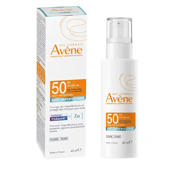 AVENE Protector Solar Anti-Imperfecciones - Diseñado especialmente para pieles grasas, mixtas y sensibles, combina una textura ultraligera y matificante con ingredientes que ayudan a mantener el cutis libre de brillos e imperfecciones. Control del sebo y reducción de brillos gracias a la acción matificante y fórmula oil-free, que ayuda a prevenir obstrucciones en los poros. Enriquecido con Monolaurina, que regula la grasa cutánea y contribuye a reducir imperfecciones. Fotoprotección alta y estable frente a rayos UVA y UVB mediante un complejo de filtros seguros y respetuosos. Acabado ligero y sin residuos blancos, ideal como base de maquillaje. Con el innovador filtro TriAsorB™ que también protege la piel de la luz azul (HEV) hasta 450 nm, ayudando a prevenir marcas post-inflamatorias e hiperpigmentación.
