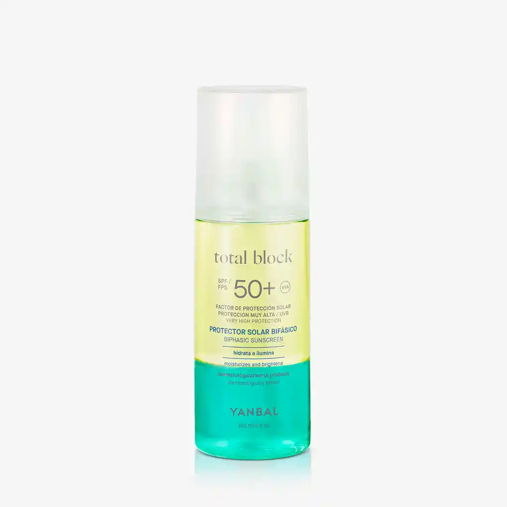 Un Total Block con fórmula bifásica en spray que protege contra rayos UVB y UVA, con SPF 50+ y PA++++; al mismo tiempo que hidrata y deja tu piel con un acabado luminoso perfecto. Con su textura ligera y ultra fresca no sentirás tu piel pesada ni grasosa. ¡Alta protección e hidratación para sentir tu piel súpre fresca y luminosa! ¿Para quién lo recomendamos? Para todo tipo de piel. Ideal para momentos de piscina o playa. Textura Textura ultra fresca y ligera que se aplica en spray.
