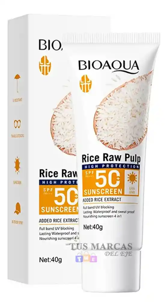 ☀️ Protector Solar BIOAQUA Rice Raw Pulp Un protector solar de alta protección formulado con extracto de arroz para cuidar y nutrir la piel mientras la protege del sol. Características Principales Alta Protección: Ofrece un factor de protección solar SPF 50+ y PA+++. Defensa de Amplio Espectro: Bloqueo total de bandas UV, protegiendo contra los rayos UVA y UVB. Ingrediente Activo: Contiene extracto de pulpa de arroz crudo para una acción nutritiva. Fórmula 4 en 1: Actúa como un protector solar nutritivo multifuncional. Resistencia: Es de larga duración y resistente tanto al agua como al sudor. Detalles del Producto Contenido: 40g. Uso Recomendado: Ideal para viajes, actividades al aire libre y deportes bajo el sol.