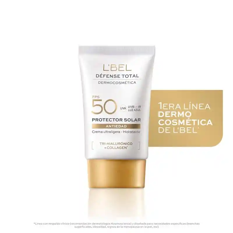Protector Solar Défense Total Anti-Edad Protector Solar Antiedad Défense Total con ácido hialurónico y collagen que reduce líneas de expresión. 30 ml e 1 fl. oz. (10.10 x 4.40 x 2.10 cm) NSOC38466-25CO. FÓRMULA INVISIBLE QUE REDUCE HASTA 10 AÑOS DE ARRUGAS* *Evaluación instrumental sobre arrugas en región periorbital con 2 grupos de edades, donde grupo de mayor edad después de 4 semanas de uso del producto igualó el valor de intensidad de arrugas del control basal del grupo menor edad. Brasil, 2024.