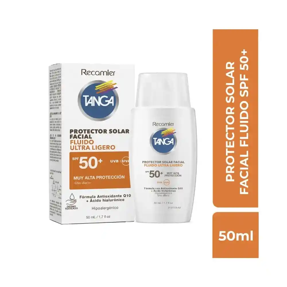 ☀️ Protector Solar Facial Fluido Ultra Ligero SPF 50+ Tanga x50ml Protector solar facial de textura ultra ligera que brinda alta protección sin dejar sensación pesada en la piel. ✔ Contenido: 50ml ✔ Protección muy alta SPF 50+ contra rayos UV ✔ Fórmula ultra ligera y de rápida absorción ✔ No deja sensación grasosa ni residuos blancos ✔ Ideal para uso diario 💧 Perfecto para pieles que buscan protección sin brillo 🌞 Ideal para climas cálidos y rutinas ligeras ⚠️ Reaplicar durante el día para mantener la protección