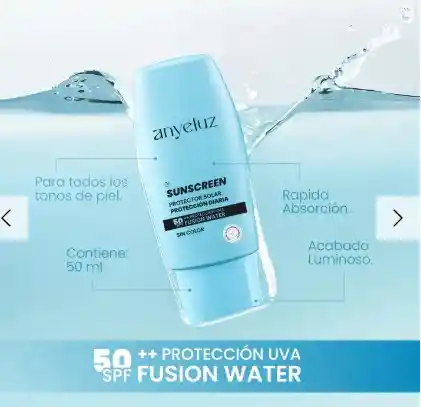 SUNSCREEN SPF50+ Fusion Water (sin color) es un protector facial de base acuosa diseñado para quien busca protección máxima sin alterar el tono de piel. Su textura ligera se absorbe rápido, protege contra UVA/UVB y ofrece un acabado luminoso sin dejar residuo blanco ni efecto flashback. Es perfecto para uso diario, fotografía y para llevar debajo del maquillaje. Dermatológicamente probado y apto para todo tipo de pieles.