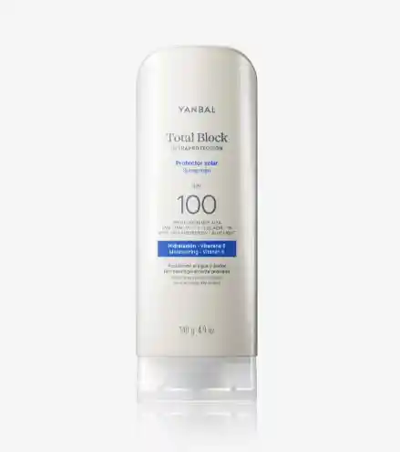 Protector Solar Total Block SPF 100 Jumbo Yanbal 140 gr Muy alta protección! Protege contra el 100% los rayos dañinos del sol (UVA, UVB), rayos IR y luz azul. Brinda hidratación, es resistente al agua y al sudor. Además, es de rápida absorción! ¿Para quién lo recomendamos? Para todo tipo de piel. Textura: Suave y no grasosa, se desliza fácilmente y de manera uniforme. INGREDIENTES: Vitamina E: Potente antioxidante que hidrata la piel y la protege de los radicales libres. UV MAX Technology: Combinación de filtros que permite una efectiva protección de amplio espectro contra el 100% de rayos dañinos del sol. Emolientes Naturales: Hidratan, suavizan y protegen. MODO DE USO: + Mantente protegido todo el día! Te recomendamos que repitas el proceso cada 3 horas. Siempre aplica uniformemente sobre la piel 15 minutos antes de exponerse al sol y estarás listo para disfrutar.