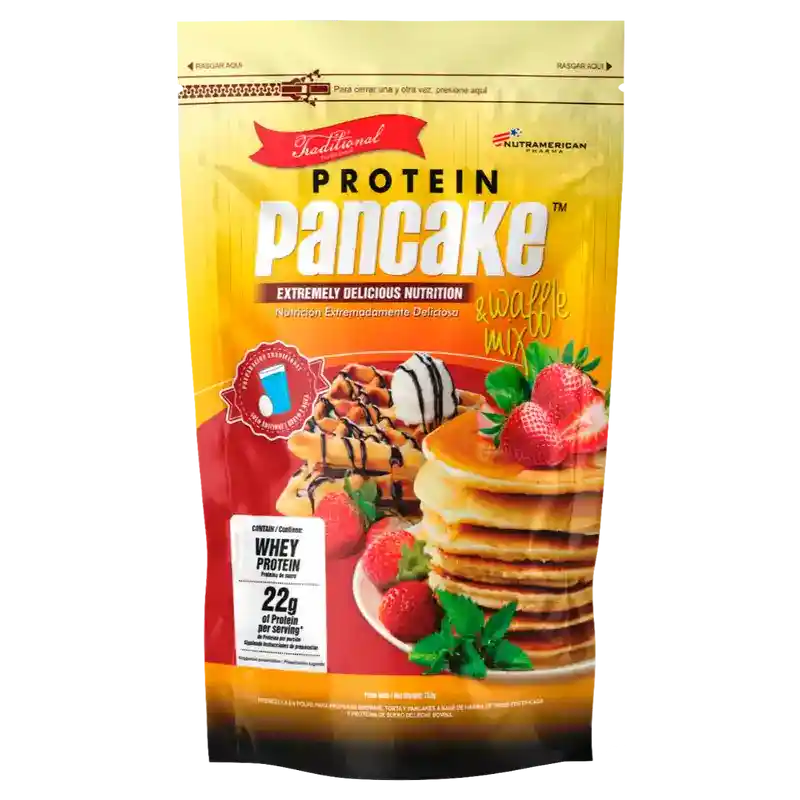 Protein Pancake Tradicional, es una mezcla para preparar deliciosos pancakes y waffles con alto aporte de proteínas, para personas que desean tener una buena nutrición basada en un consumo apropiado de nutrientes, todo gracias a su avanzada y deliciosa formula. Protein Pancake aporta 22 g de proteína por servicio.