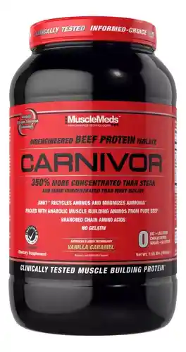 La proteína Carnivor de MuscleMeds, en su presentación de 2 libras (907 g), es una proteína de carne de res hidrolizada. Ofrece alrededor de 23-30 g de proteína por porción, es baja en grasa y carbohidratos, y está diseñada para apoyar el crecimiento muscular y la recuperación. Viene en varios sabores y puede incluir aminoácidos y enzimas digestivas para mejorar la absorción.