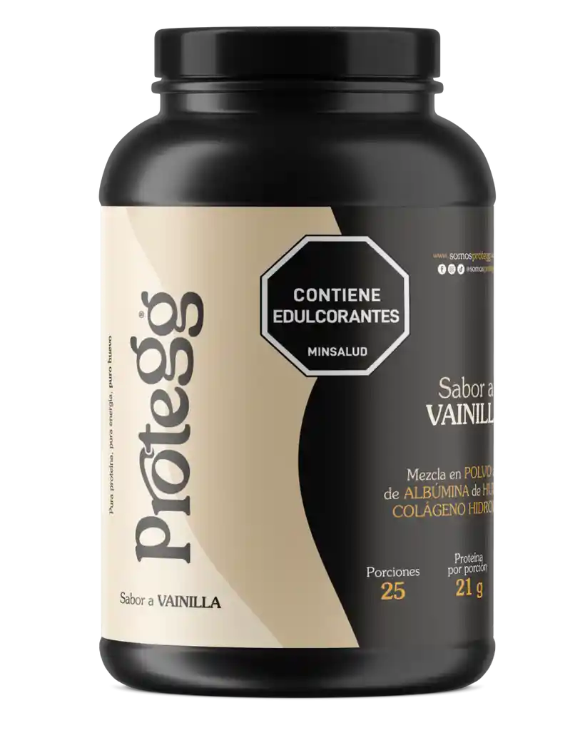 "Proteína de claras de HUEVO con COLAGENO HIDROLIZADO, sabor Vainilla, ideal para la recuperación muscular y complementar el consumo de proteína diario, presentación en tarro de 750 gramos, 25 porciones, 21 gramos de proteína por porción. Es libre de azúcar, libre de lácteos, libre de grasa, libre de gluten. libre de soya. Contiene vitamina C y E, es endulzada con STEVIA."