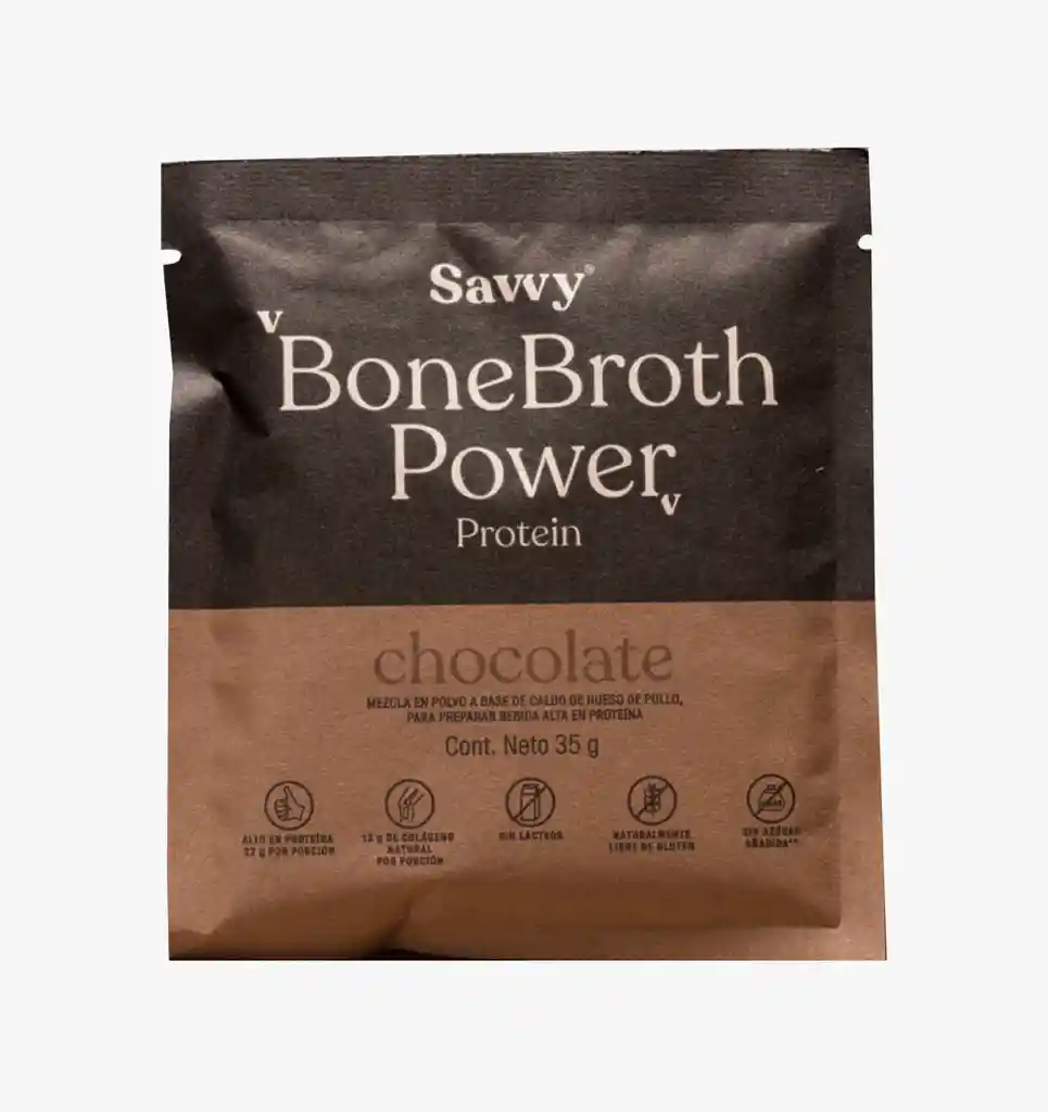 Caldo de hueso de pollo en polvo, cocoa, triglicéridos caprilicos MCT C8 (trigliceridos de cadena media, proteina de arveja, fibra de yuca, SSL, lecitina de girasol ( 0.03g), dioxido de silicio (0.06g), sabor natural de chocolate, edulcorante natural ( stevia), espesantes ( goma arabiga, goma xantana y goma guar) y extracto de fruto del monje. Porciones por envase 16.