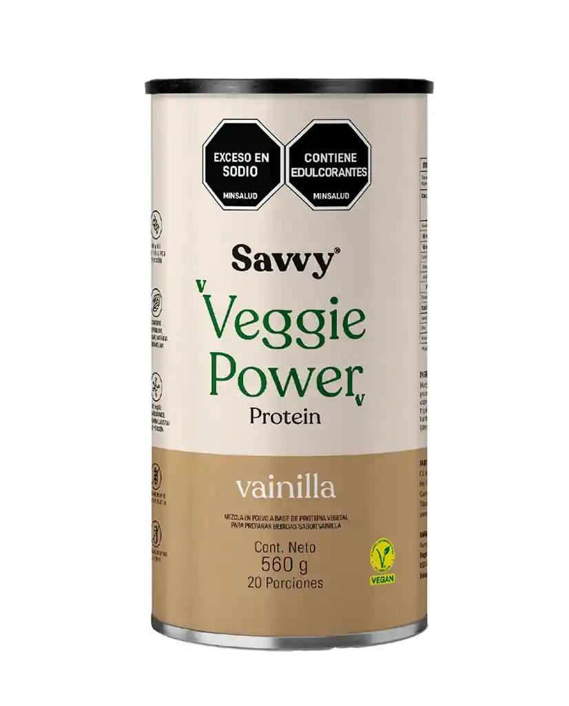 Proteina veggie powder vanilla Savvy • Una proteína en polvo proveniente de la arveja, el arroz y la almendra • 18 gr de proteína efectiva •Con proteína de almendra que le da un delicioso toque de cremosidad y sabor • Te da mayor saciedad • Perfil de aminoácidos con buen contenido de BCAAs (entre ellos leucina) y glutamina •Con hierro, metilfolato (B9), vitamina D, vitamina B12