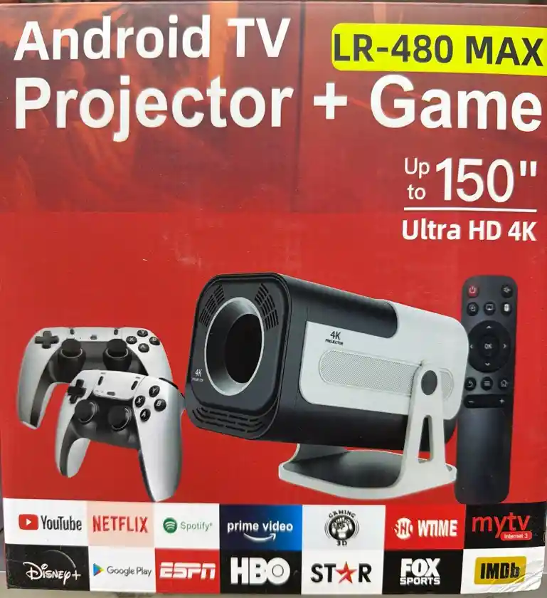 Marca/Modelo: Android TV Projector LR-480 MAX. Calidad de Imagen: Ofrece resolución Ultra HD 4K. Tamaño de Proyección: Capaz de proyectar imágenes de hasta 150 pulgadas. Sistema Operativo: Funciona con Android TV, lo que permite acceso a diversas aplicaciones. Conectividad y Aplicaciones: Es compatible con aplicaciones populares como YouTube, Netflix, Spotify, Prime Video, Disney+, Google Play, HBO, Star, Fox e IMDb, lo que sugiere conectividad a internet (Wi-Fi). Funciones Adicionales: Soporte para Gaming. Capacidad 3D. Funcionalidad "MyTV Internet".