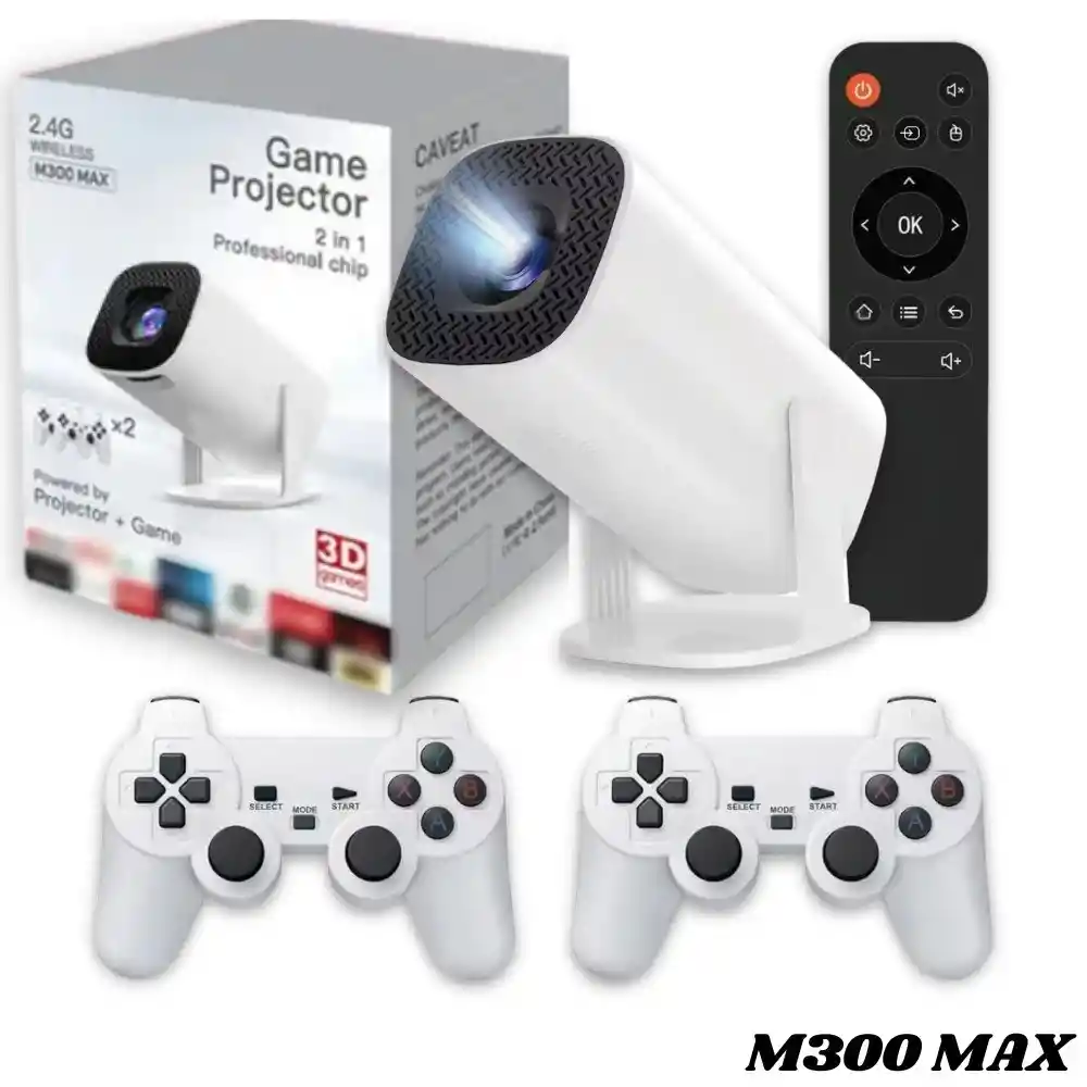 Proyector De Pantalla Android Tv Con Consola De Videojuegos Retro Ultra Incorporados M300 Max Eleva tu experiencia de entretenimiento a otro nivel con este Proyector Inteligente, el dispositivo perfecto para disfrutar de cine en casa, videojuegos retro y contenido en línea, todo desde un solo aparato. Con un diseño compacto y potente, ofrece una calidad de imagen excepcional y acceso a una amplia gama de plataformas y aplicaciones. Características Principales: - Acceso Total a Contenidos: Viene con plataformas ya instaladas como YouTube, Google Play, permitiéndote acceder rápidamente a tu contenido favorito. - Calidad de Imagen Full HD con su proyección de imágenes nítidas y detalladas, asegura una calidad visual impresionante, ofreciendo una experiencia aún más espectacular y envolvente. - Tamaño de Proyección Ajustable: Disfruta de una pantalla de proyección de 30” a 110” (pulgadas), dependiendo de la distancia de proyección, lo que te permite adaptarlo a cualquier espacio y crear la experiencia visual que desees. - Entretenimiento Retro sin Límites: Incluye una memoria SD de 64 GB con más de 1,000 juegos retro listos para jugar. Además, soporta múltiples emuladores para revivir los mejores juegos clásicos de todos los tiempos. - Controles Inalámbricos para Mayor Comodidad: El paquete incluye 2 controles de juegos inalámbricos, lo que te permite disfrutar de tus juegos retro sin cables ni limitaciones. - Conectividad Versátil: Con puertos USB, HDMI, y jack de audio de 3.5mm, podrás conectar diversos dispositivos como consolas, laptops o reproductores multimedia. Especificaciones Técnicas: Tecnología de Proyección: LCD Resolución Nativa: 1920x1080P (Full HD) Sistema Operativo: Android Wi-Fi: 2.4G/5G Interfaz: USB, HDMI, AUX ¿Qué incluye la caja? 1 Proyector de pantalla 1 Cable de corriente 1 Tarjeta SD de 64GB con más de 1,000 juegos 1 Control remoto para Proyector 2 Controles inalámbricos de juegos 1 Manual de uso Nota Adicional Importante: Es importante tener en cuenta que algunas plataformas de streaming, como Netflix, Prime Video, Disney+, entre otras, están en constante actualización y cambio de políticas. Debido a estos cambios, las aplicaciones pueden quedar obsoletas con el tiempo. Para evitar inconvenientes, se recomienda NO realizar actualizaciones del proyector. Esto ayudará a mantener la compatibilidad con las aplicaciones ya instaladas y garantizar una experiencia de uso más estable