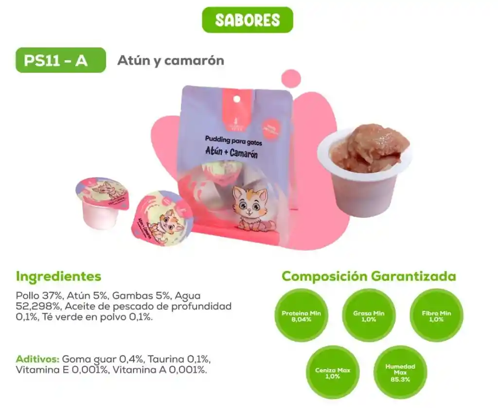 Un snack cremoso y altamente palatable que encantará a los gatos más exigentes. Elaborado con atún y camarón de alta calidad, este pudín ofrece una combinación irresistible de sabor marino y textura suave, ideal como premio diario o complemento alimenticio. Además de su delicioso sabor, es una fuente natural de proteínas y omega-3, que favorecen una piel sana, un pelaje brillante y una buena digestión. Su presentación en prácticos sobres individuales garantiza frescura en cada porción.