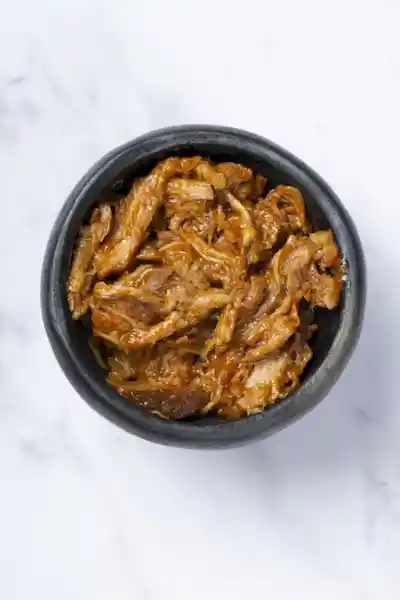 Brazo magro de cerdo cocinado durante varias horas en jugo de naranja y especias.Cantidad 60g.