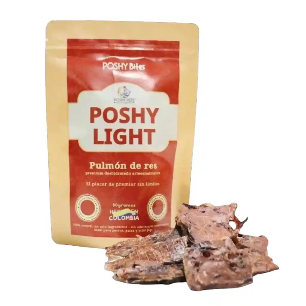 Tu peludito también merece algo natural. Sabor sin límites, peso bajo control. POSHY LIGHT ofrece pulmón de res deshidratado, un snack de textura aireada y crujiente que satisface el deseo de masticar sin aportar grasas excesivas. Es la opción perfecta para premiar frecuentemente a mascotas en regímenes de control de peso o como un snack ligero entre comidas. Beneficio Clave: Bajo en grasa y alta satisfacción sensorial. Origen: Fabricación Local Colombiana Ingredientes: 100% Pulmón de Res Presentación: Doypack con cierre hermético para máxima frescura. Uso: Complemento alimenticio / Premio. Peso: 80 grs Registro ICA: 01387002025