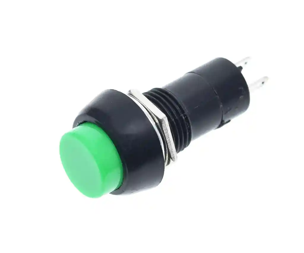 Nombre del producto: interruptor de botón Tipo de acción: momentáneo sin bloqueo automático Tipo de contacto: 1 Normalmente Abierto Voltaje: 250VAC / 3A Terminales: 2 pines Diámetro del agujero: 12 mm Ancho del pie: 3 mm Espesor: 0,5 MM LA COMPRA INCLUYE: 1X PULSADOR PLASTICO PBS-11B 2PIN 12mm VERDE
