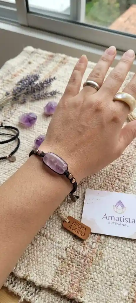 AMATISTA Lleva contigo la energía de la tierra. Nuestras pulseras están tejidas 100% a mano con hilo de alta resistencia y terminaciones en acero/bronce. Cada pieza cuenta con una piedra natural auténtica en corte rectangular, pulida para resaltar su brillo y vetas únicas. ○Hecho a mano: Artesanía local con atención al detalle. ○Ajustable: Sistema de cierre corredizo que se adapta a cualquier tamaño de muñeca. ○Materiales: Piedras naturales genuinas y herrajes de alta durabilidad. ○Género: Diseño unisex, ideal para compartir en pareja o regalar.