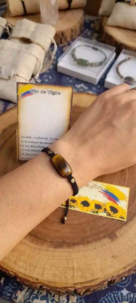 OJO DE TIGRE Lleva contigo la energía de la tierra. Nuestras pulseras están tejidas 100% a mano con hilo de alta resistencia y terminaciones en acero/bronce. Cada pieza cuenta con una piedra natural auténtica en corte rectangular, pulida para resaltar su brillo y vetas únicas. ○Hecho a mano: Artesanía local con atención al detalle. ○Ajustable: Sistema de cierre corredizo que se adapta a cualquier tamaño de muñeca. ○Materiales: Piedras naturales genuinas y herrajes de alta durabilidad. ○Género: Diseño unisex, ideal para compartir en pareja o regalar.