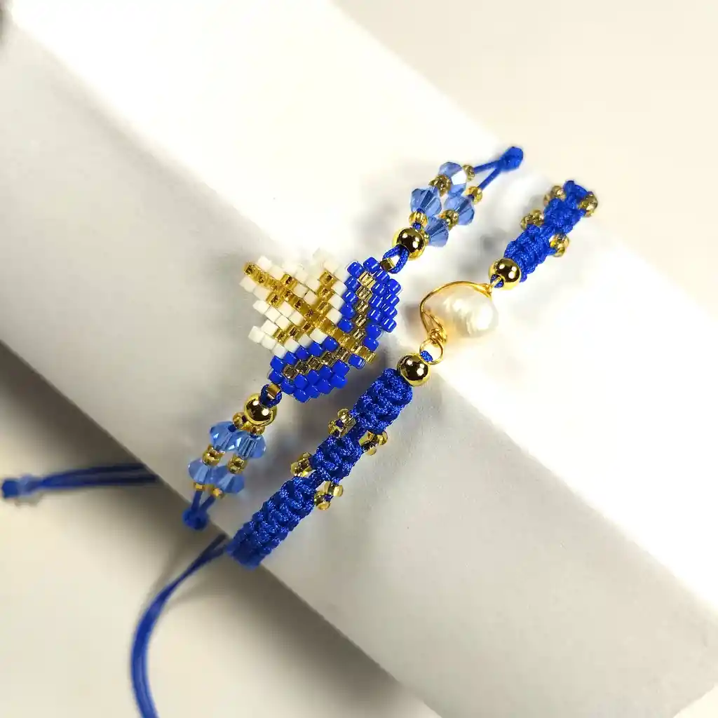 Diseño juvenil en hilo chino con detalles en miyuki y balines de rodio que brindan un acabado moderno y atractivo.