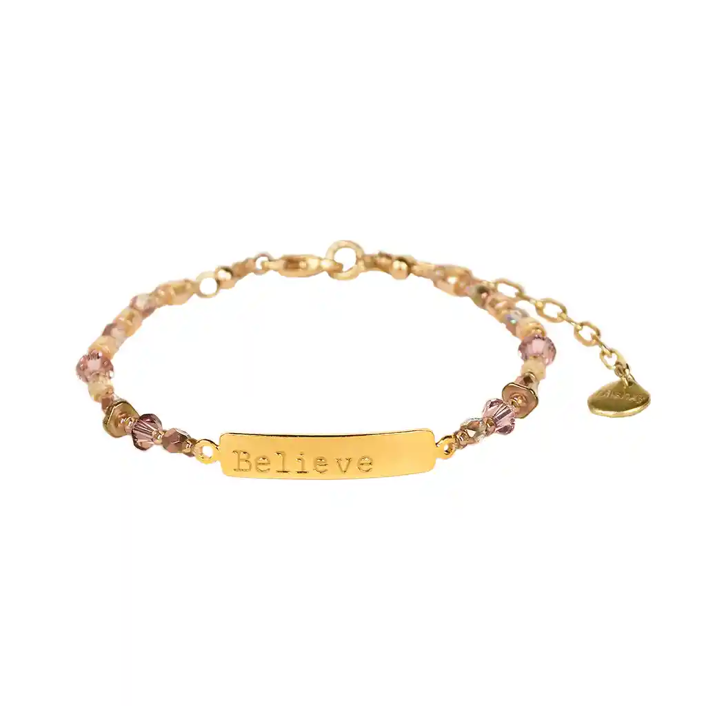 Pulsera artesanal elaborada con delicadas cuentas redondas de vidrio, tejidas con hilo de alta resistencia. Incluye un detalle exclusivo Mini Believe en bronce con baño dorado, acompañado de una cadena stender en bronce bañada en oro. Colores: Gold & Pink Área tejida: ancho 0.2" (0.5 cm) Largo total: 5.1" (13 cm) Un accesorio elegante y versátil, perfecto para quienes buscan piezas únicas con identidad artesanal y un toque contemporáneo.