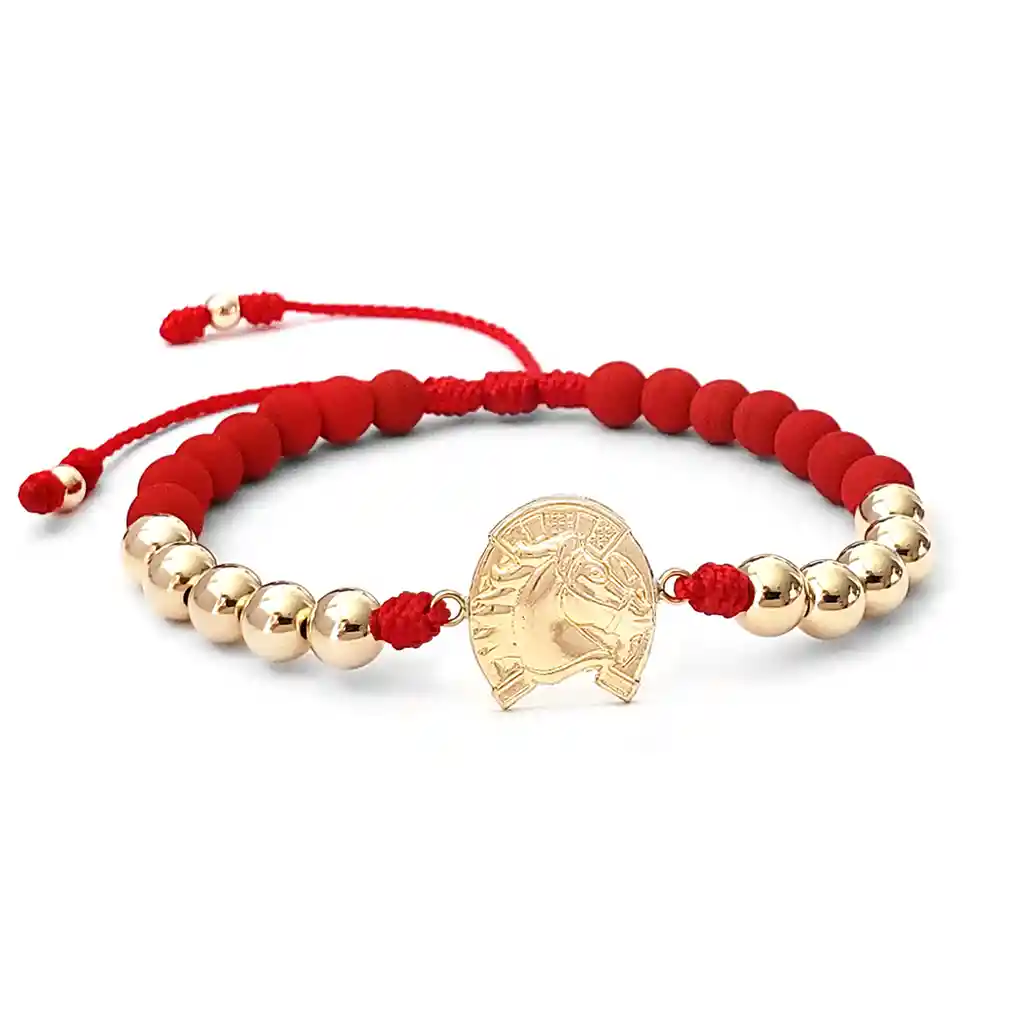 Pulsera elaborada con Cordón Italiano, Neopreno, Balines 6 mm y Dije de Caballo con Herradura en Oro Laminado 18k. Va empacada en Cajita para Obsequio. Medidas: El dije mide 18 milímetros de largo por 15 milímetros de ancho. Lleva 10 balines de oro laminado de 6 milímetros y 2 balines colgantes de 4 milímetros. ¿Para qué se usa el Dije de Caballo con Herradura? El dije de Caballo con Herradura es un símbolo de buena suerte y protección. En muchas culturas, el caballo representa la fuerza, la libertad y la nobleza, mientras que la herradura es un amuleto tradicionalmente asociado con la suerte y la protección. Llevar este dije puede ser un recordatorio de perseverancia y determinación, atrayendo energías positivas y protección a quien lo porte. ¿Qué es el Oro Laminado? El Oro Laminado está conformado por una base de titanio recubierta de manera experta con tres capas de Oro de 18k que se someten a un proceso de horneado meticuloso, logrando así una apariencia y brillo indistinguibles del oro auténtico. Posee una extraordinaria resistencia al agua, al sudor y a las lociones, lo que garantiza que su tono dorado no se desvanezca con el paso del tiempo. Garantía: El producto se encuentra respaldado por una garantía de 1 año. (No cubre raspaduras, ralladuras o abolladuras por mala manipulación). Tallas disponibles: ESTANDAR