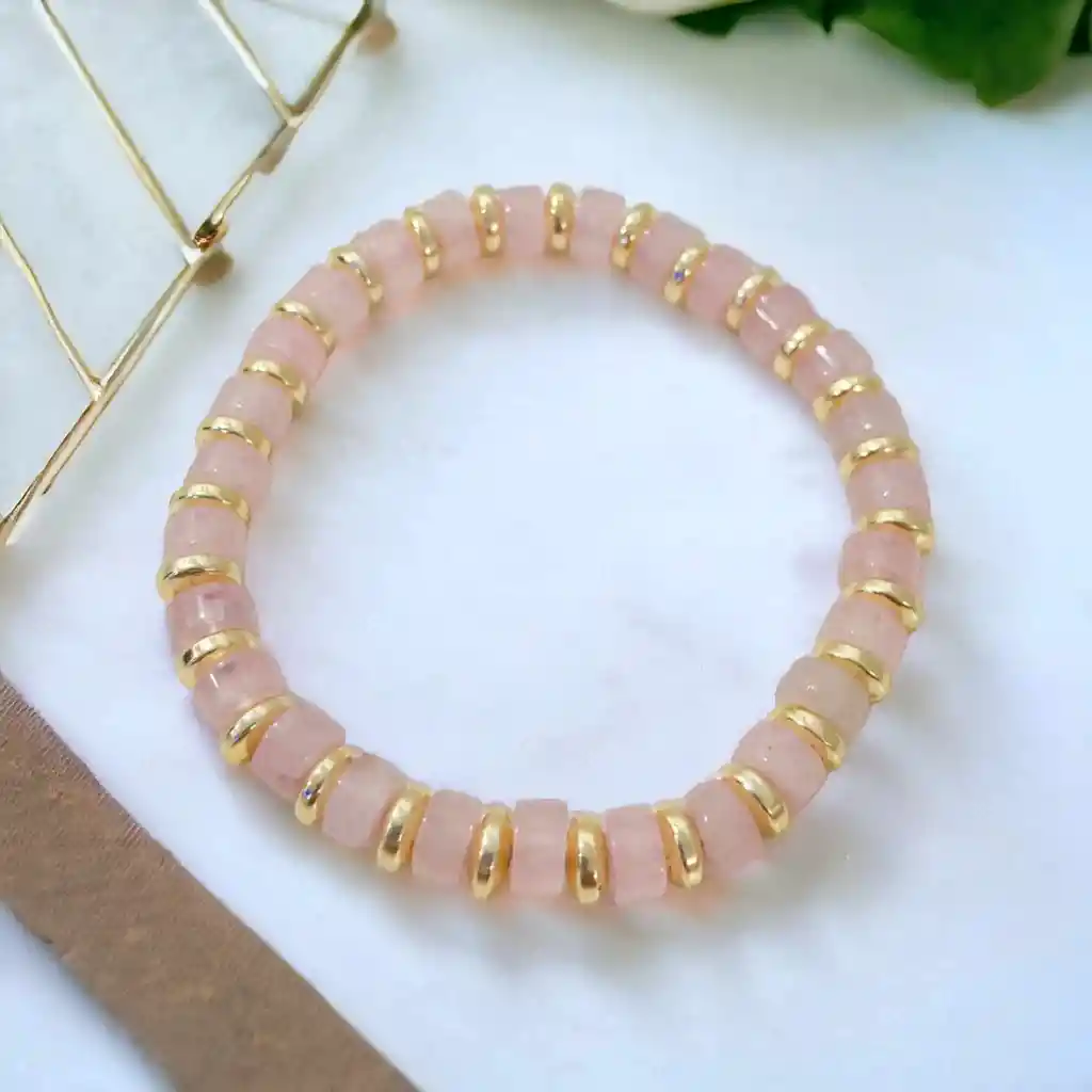 Pulsera de cuarzo rosa y detalles dorados