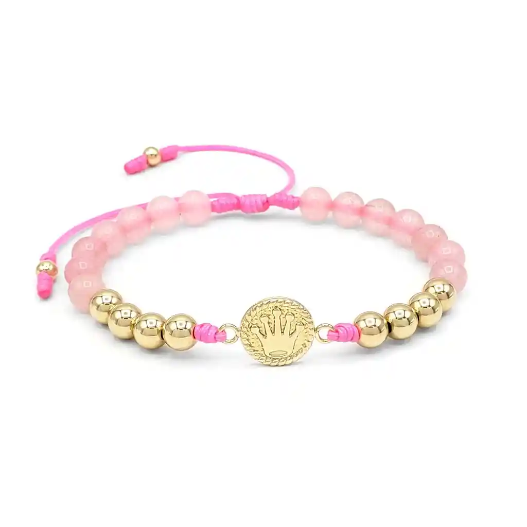 Te presentamos nuestra pulsera elaborada con Cordón Italiano, Piedra Natural Cuarzo Rosado, Dije Corona Rolex y Balines de Oro Laminado 18k de 6mm. Va empacada en Cajita para Obsequio. Medidas: El dije mide 12 mm de diámetro, las piedras de cuarzo rosado son de 6 mm, los balines de oro laminado 18k son dos (2) de 4 mm y ocho (8) de 6 mm. Propiedades del Cuarzo Rosado: - Amor y armonía: El cuarzo rosado es conocido como la piedra del amor incondicional. Se cree que fomenta la armonía y la compasión en las relaciones, además de ayudar a sanar heridas emocionales y a fortalecer la autoestima. - Calma y serenidad: Se dice que el cuarzo rosado puede aportar paz y tranquilidad a quien lo lleva, ayudando a reducir el estrés y la ansiedad, promoviendo una sensación de bienestar y equilibrio. Signos Zodiacales Relacionados: Tauro, Libra y Cáncer. ¿Por qué usar pulseras de Coronas? Las pulseras de coronas simbolizan el amor, el respeto y la lealtad que se tienen el uno al otro. Las coronas representan la realeza y el poder, y al usarlas se demuestra que se consideran el rey y la reina de su relación. Son elegantes, originales y llamativas, y pueden expresar la personalidad y el gusto de quien las lleva. ¿Qué es el Oro Laminado? El Oro Laminado está conformado por una base de titanio recubierta de manera experta con tres capas de Oro de 18k que se someten a un proceso de horneado meticuloso, logrando así una apariencia y brillo indistinguibles del oro auténtico. Posee una extraordinaria resistencia al agua, al sudor y a las lociones, lo que garantiza que su tono dorado no se desvanezca con el paso del tiempo. Garantía: El producto se encuentra respaldado por una garantía de 1 año. (No cubre raspaduras, ralladuras o abolladuras por mala manipulación). Tallas disponibles: ESTANDAR