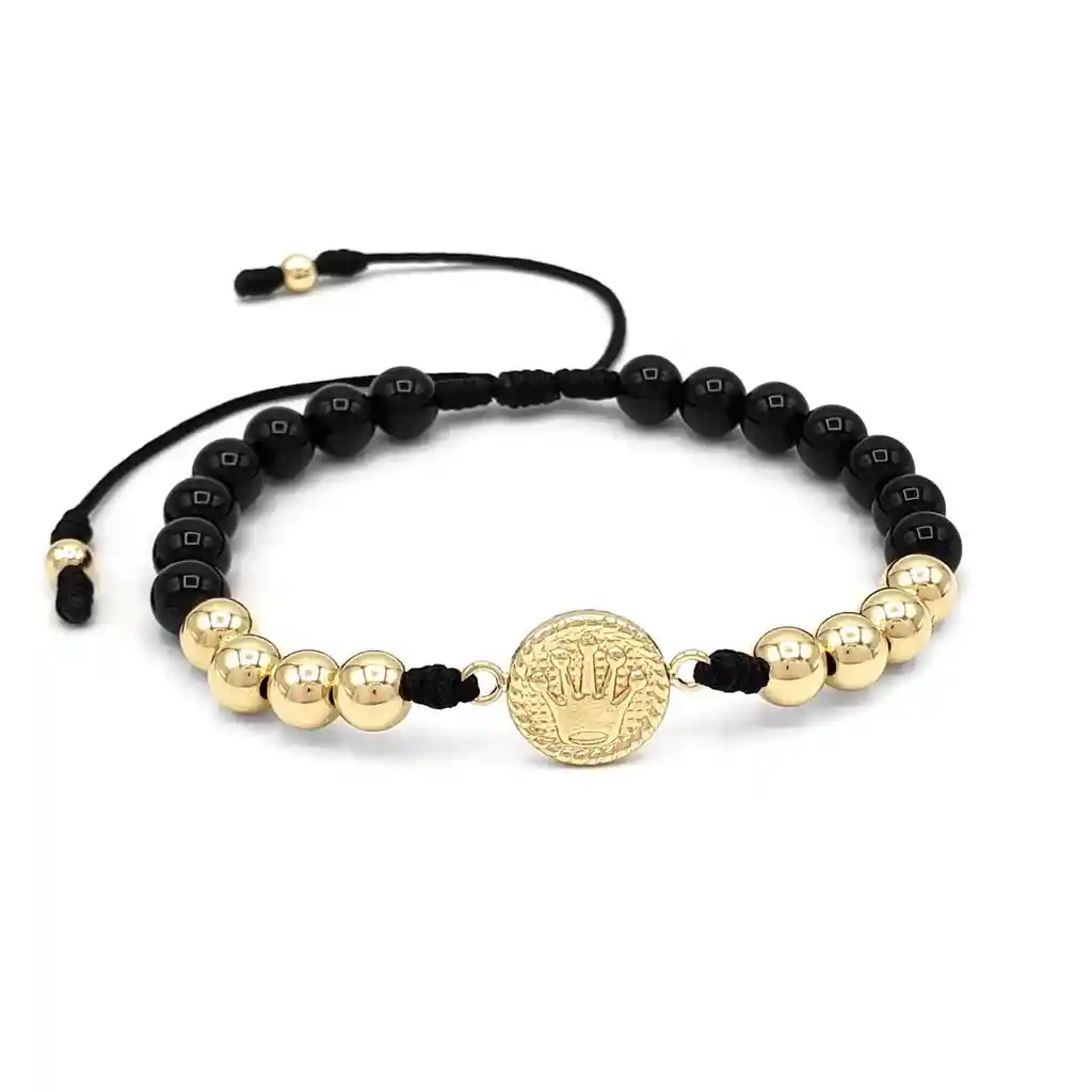 Te presentamos nuestra pulsera elaborada con Cordón Italiano, Piedra Natural Ónix Negro Brillante, Dije Corona Rolex y Balines de Oro Laminado 18k de 6mm. Va empacada en Cajita para Obsequio. Medidas: El dije mide 12 mm de diámetro, las piedras ónix son de 6 mm, los balines de oro laminado 18k son dos (2) de 4 mm y ocho (8) de 6 mm. Propiedades de la Piedra Ónix: - Protección: En algunas culturas, el ónix se asocia comúnmente con la protección. Se cree que esta piedra puede ayudar a crear un escudo energético que protege contra energías negativas y malas influencias. - Fuerza y resistencia: El ónix se asocia con la fuerza y la resistencia física y mental. Se cree que proporciona energía y vigor, ayudando a superar obstáculos y desafíos. Signos Zodiacales Relacionados: Capricornio, Leo y Escorpio. ¿Por qué usar pulseras de Coronas? Las pulseras de coronas simbolizan el amor, el respeto y la lealtad que se tienen el uno al otro. Las coronas representan la realeza y el poder, y al usarlas se demuestra que se consideran el rey y la reina de su relación. Son elegantes, originales y llamativas, y pueden expresar la personalidad y el gusto de quien las lleva. ¿Qué es el Oro Laminado? El Oro Laminado está conformado por una base de titanio recubierta de manera experta con tres capas de Oro de 18k que se someten a un proceso de horneado meticuloso, logrando así una apariencia y brillo indistinguibles del oro auténtico. Posee una extraordinaria resistencia al agua, al sudor y a las lociones, lo que garantiza que su tono dorado no se desvanezca con el paso del tiempo. Garantía: El producto se encuentra respaldado por una garantía de 1 año. (No cubre raspaduras, ralladuras o abolladuras por mala manipulación). Tallas disponibles: ESTANDAR