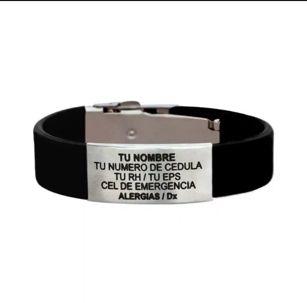 Pulsera de identificacion personal personalizada con datos personales de emergencia : Personálizala con NOMBRE, CEDULA , RH, EPS, CONTACTOS DE EMERGENCIA, ENFERMEDADES O ALERGIAS Esta pulsera es Salva vidas , es ajustable a la mano la puedes cortar a tu medida y con broche de seguridad. la pulsera es de 1 cm de ancho y de largo tiene 21 cm